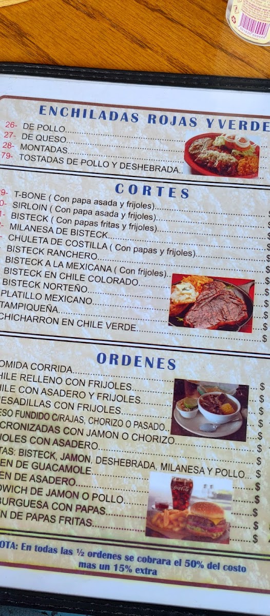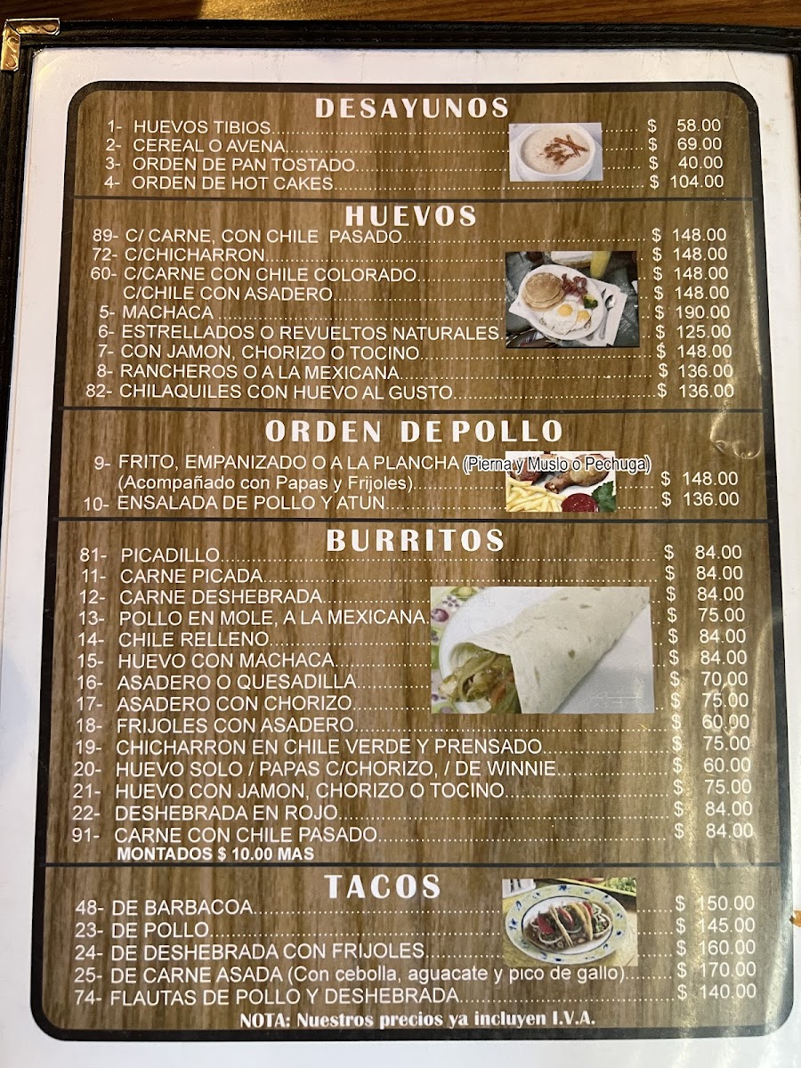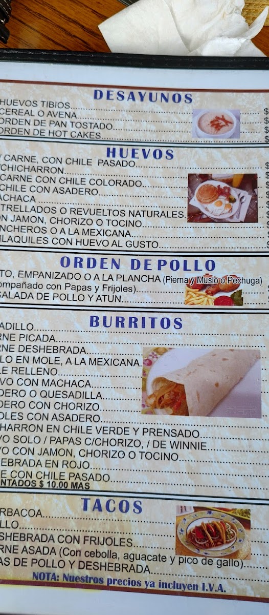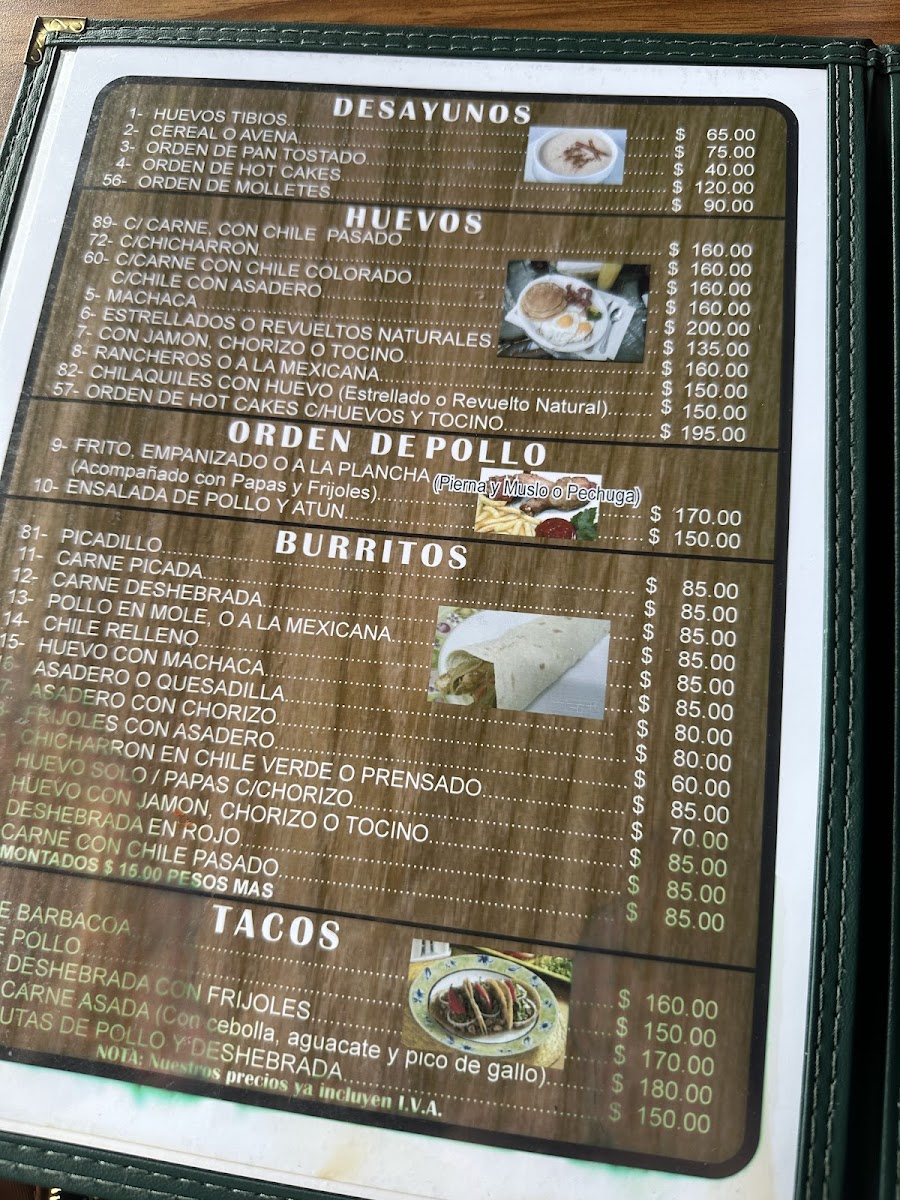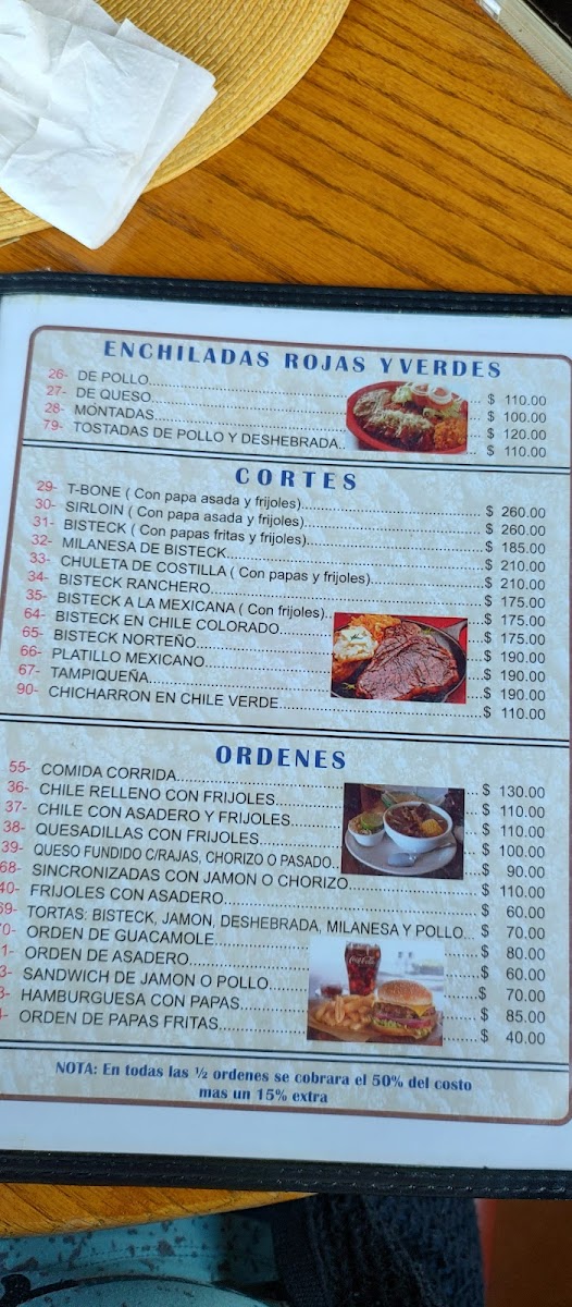 The menu features a variety of traditional Mexican dishes, organized into categories suitable for different meal times including breakfast, lunch, and dinner. Visitors can find classic options such as breakfast plates with eggs and hot cakes, traditional stews like menudo, and various taco preparations including barbacoa. Main dishes include cuts of beef such as sirloin and rib chops, as well as chicken options like fried breast. Burritos are offered with fillings such as barbacoa, chile relleno, and asadero cheese with chorizo. Enchiladas and chilaquiles are also part of the selection, providing typical Mexican flavors.