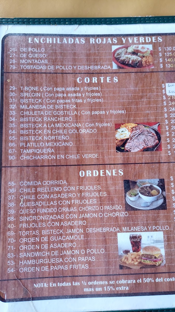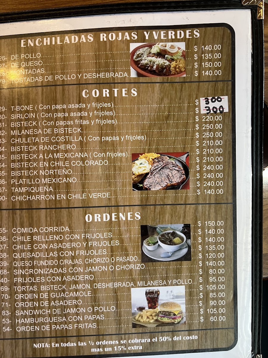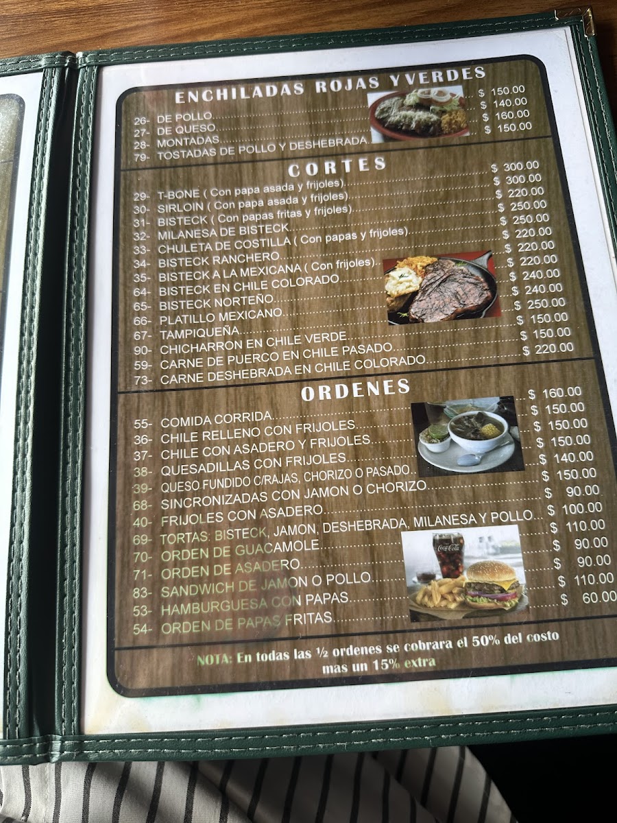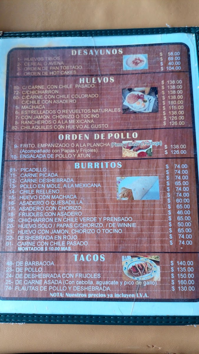 The menu features a variety of traditional Mexican dishes, organized into categories suitable for different meal times including breakfast, lunch, and dinner. Visitors can find classic options such as breakfast plates with eggs and hot cakes, traditional stews like menudo, and various taco preparations including barbacoa. Main dishes include cuts of beef such as sirloin and rib chops, as well as chicken options like fried breast. Burritos are offered with fillings such as barbacoa, chile relleno, and asadero cheese with chorizo. Enchiladas and chilaquiles are also part of the selection, providing typical Mexican flavors.